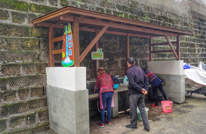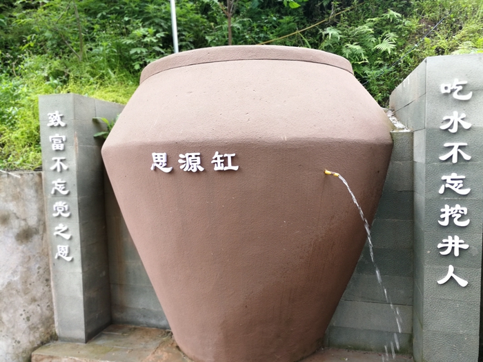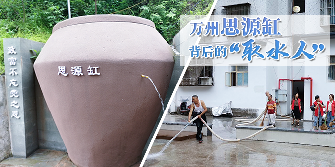 万州区双河口街道富康花园小区,花团紧簇的大门对面,有一口直径约两米的大缸,清亮山泉从龙宝山泊泊涌入,穿过地下水管又从小区内的共享洗衣台喷出。中间有名曰“思源缸”,两边镌刻对联“致富不忘党之恩,吃水不忘挖井人”。