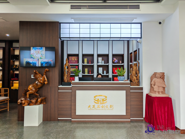 据介绍,该门店由大足开发建设有限公司(大足石刻文创园平台公司)投资运营,总投资近百万元,筹备近4个月后正式开业。店内面积约200平方米,主要展示销售具有大足石刻文化元素的文创产品及本地特色旅游商品,包括大足石刻文创园入驻企业、大师创作的石雕、木雕、玉雕工艺品及自主开发的“昌州酿”荷莲酱香酒、昌州红茶等近百款产品。