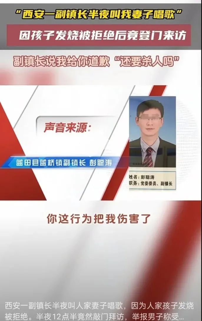 在该网传视频中,据举报男子描述:“4月26日晚上11点半,我媳妇突然接到西安市蓝田县蓝桥镇副镇长彭某电话,命令她去KTV唱歌,我媳妇说孩子发烧去不了,我也对此表示强烈不满,没想到12点半了,他又亲自跑到我家,这件事对我身心造成极大损伤。”