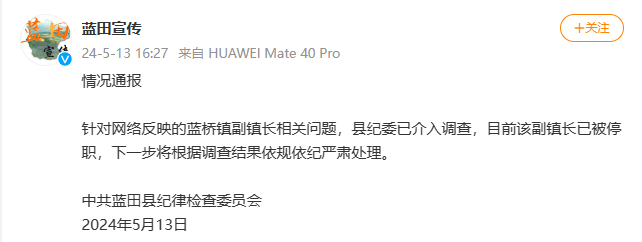 5月13日,中共蓝田县纪律检查委员会发布情况通报:针对网络反映的蓝桥镇副镇长相关问题,县纪委已介入调查,目前该副镇长已被停职,下一步将根据调查结果依规依纪严肃处理。
