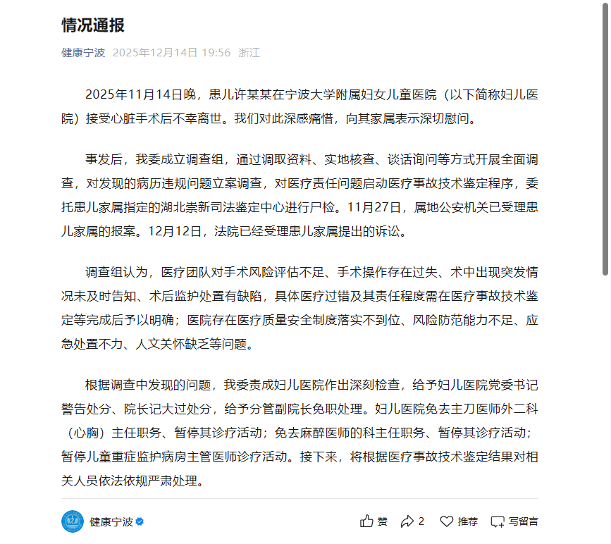 2025年11月14日晚,患儿许某某在宁波大学附属妇女儿童医院(以下简称妇儿医院)接受心脏手术后不幸离世。我们对此深感痛惜,向其家属表示深切慰问。