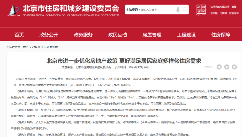 北京市贯彻落实中央经济工作会议精神,着力稳定房地产市场。12月24日,市住房城乡建设委、市发展改革委、人民银行北京市分行、北京住房公积金管理中心等4部门联合印发《关于进一步优化调整本市房地产相关政策的通知》(以下简称《通知》),自2025年12月24日起施行。
