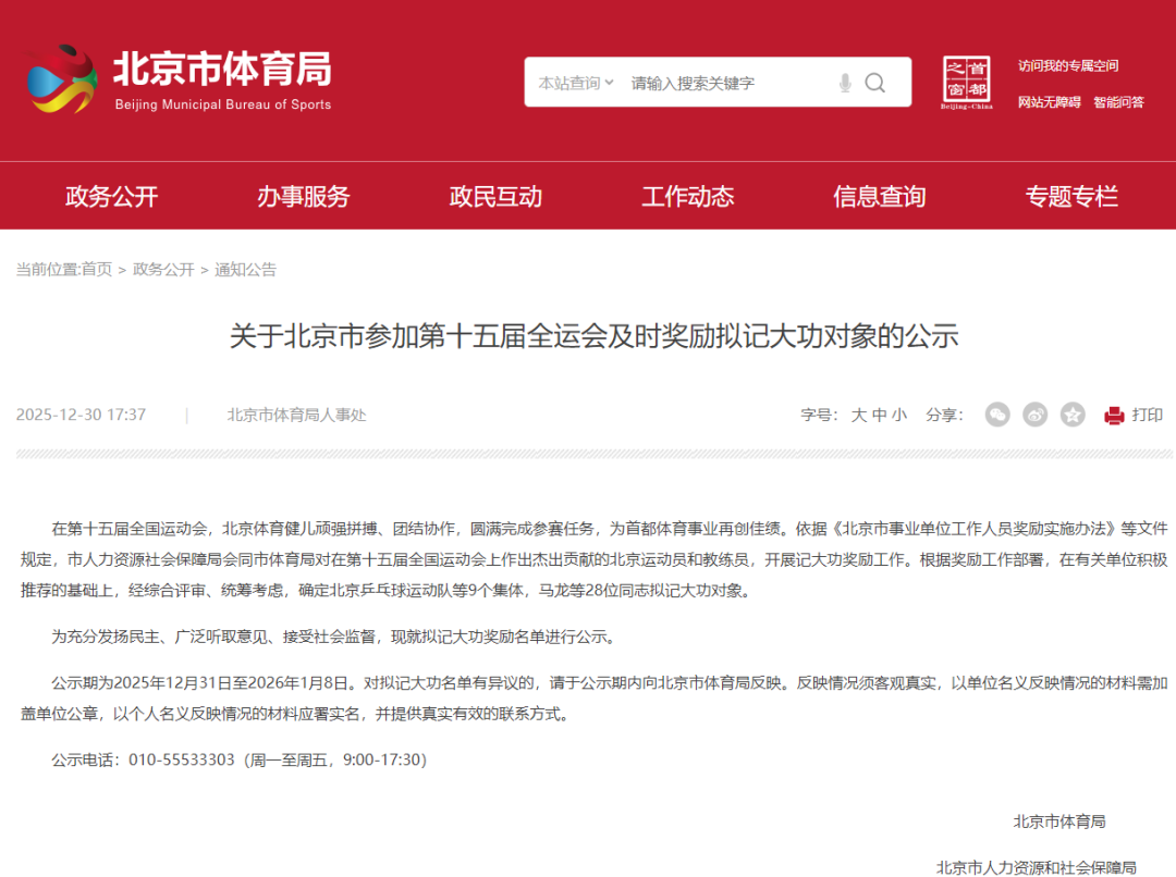 12月30日,北京市体育局网站发布关于北京市参加第十五届全运会及时奖励拟记大功对象的公示。