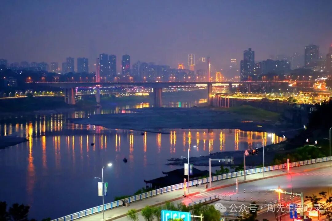 入夜,则又是另一番辉煌的宁静。井双湾区滨江路和楼宇的灯火次第点亮,先是零星几点,继而连成一片,最终汇成一条璀璨的光带,倒映在墨黑的江水中,随波流动,宛如梦境。双碑大桥和高家花园大桥化身光影的彩虹,横跨江面。偶尔有夜航的船缓缓驶过,船上的灯火像一颗缓慢移动的星,拖出一道长长的、破碎的光尾。书屋里的灯光温暖地亮着,从外面看,它成了山顶一粒柔和的、发光的琥珀,在这宏大的夜色里,微小却坚定地存在着。