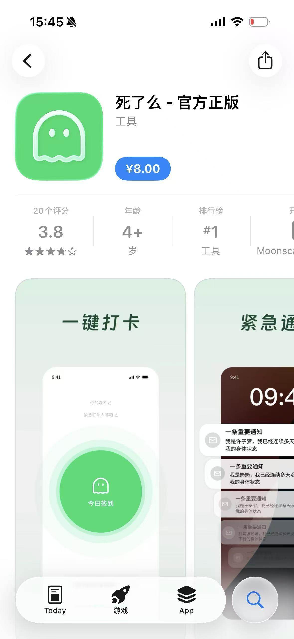 1月8日,一款叫“死了么”的App受到关注,相关帖子点赞过万。据介绍,该应用是为独居人群打造的轻量化安全工具,需要设置紧急联系人,若连续多日没在应用内签到,系统将于次日自动发送邮件告诉紧急联系人。购买该软件需要8元人民币。目前仅上线苹果应用商店,安卓系统应用商店尚未上架。截至稿件发布,该款App在苹果付费软件排行榜位列第1。