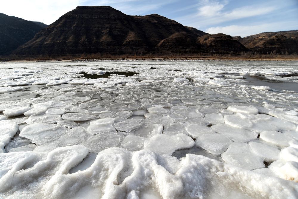受近日寒潮天气影响,黄河中游晋陕峡谷流凌密度持续增大,位于山西吉县和陕西宜川县交界的黄河壶口瀑布段1月21日出现今年首次流凌封河景观。