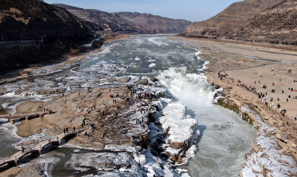 站在壶口瀑布岸边,只见平日里奔腾咆哮的壶口瀑布落差显著变小,只有10米左右,河水裹挟着大量的流凌浮跃而下,在壶口瀑布下游堆积凝结,远远望去,宛若一条白色巨龙静卧在峡谷之中。