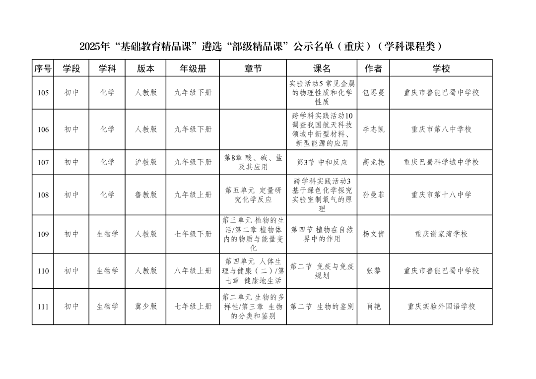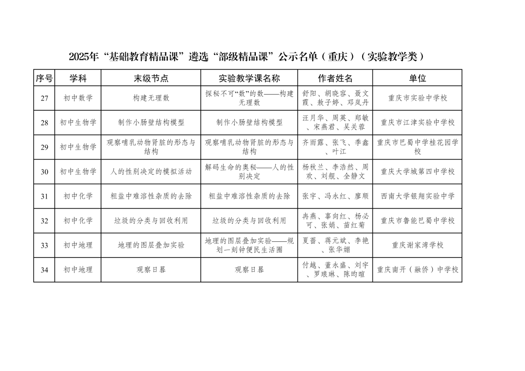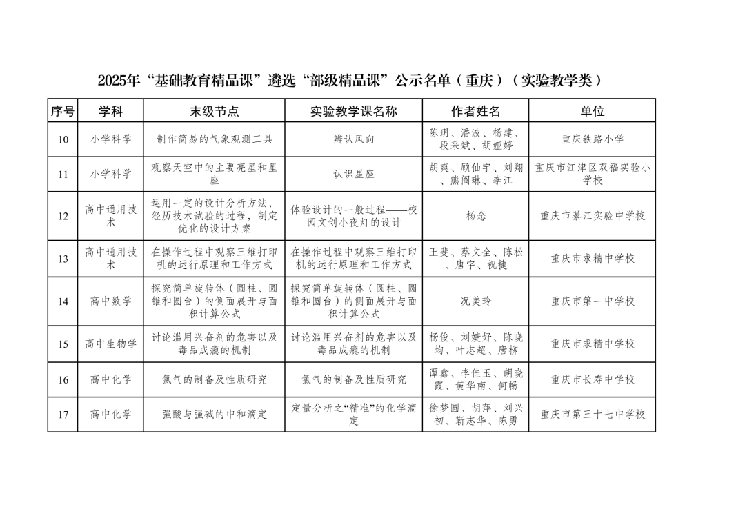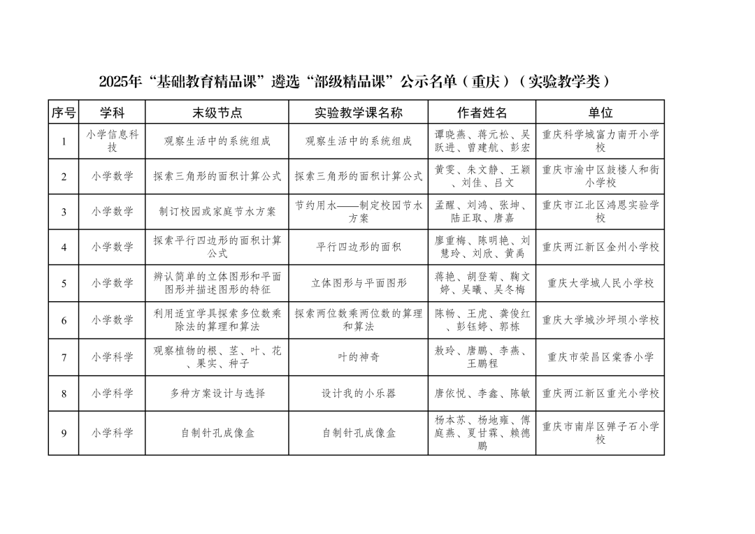 2025年“基础教育精品课”遴选“部级精品课”公示名单(重庆)(实验教学类)