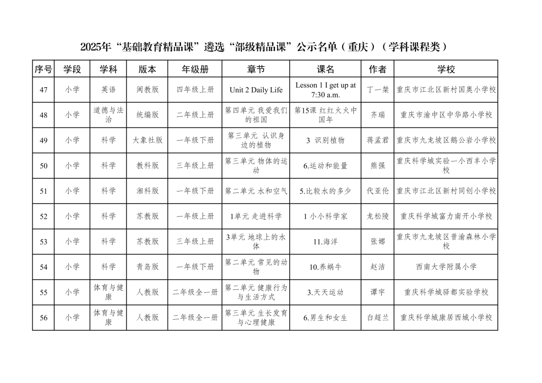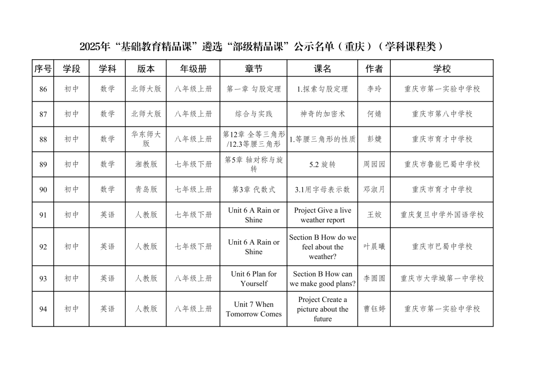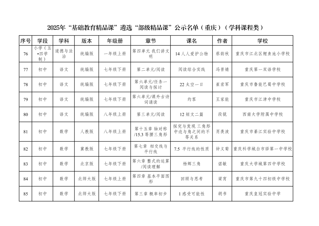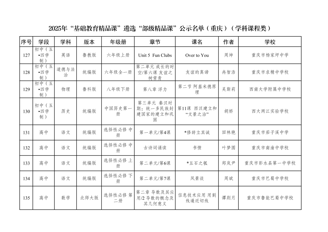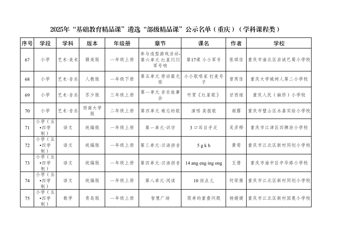 2025年“基础教育精品课”遴选“部级精品课”公示名单(重庆)(学科课程类)