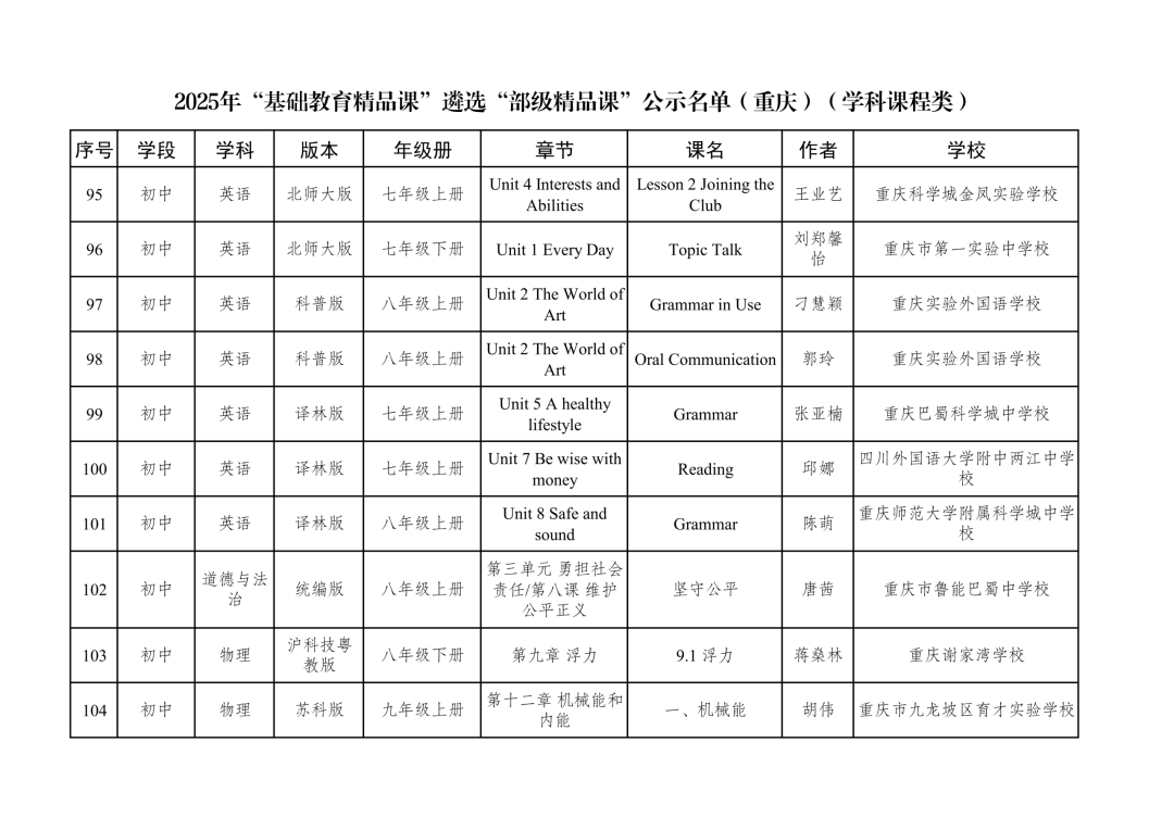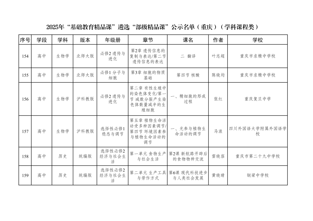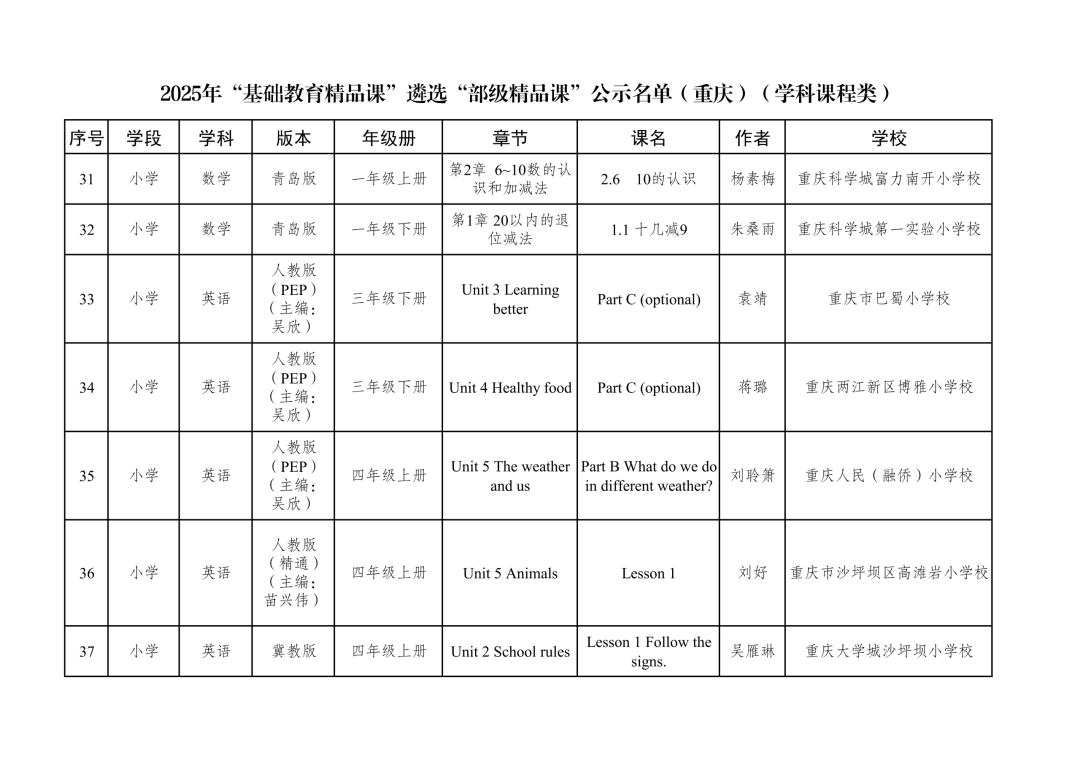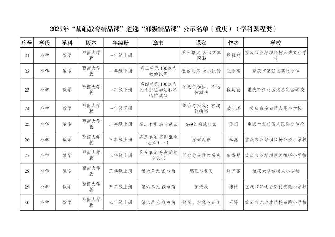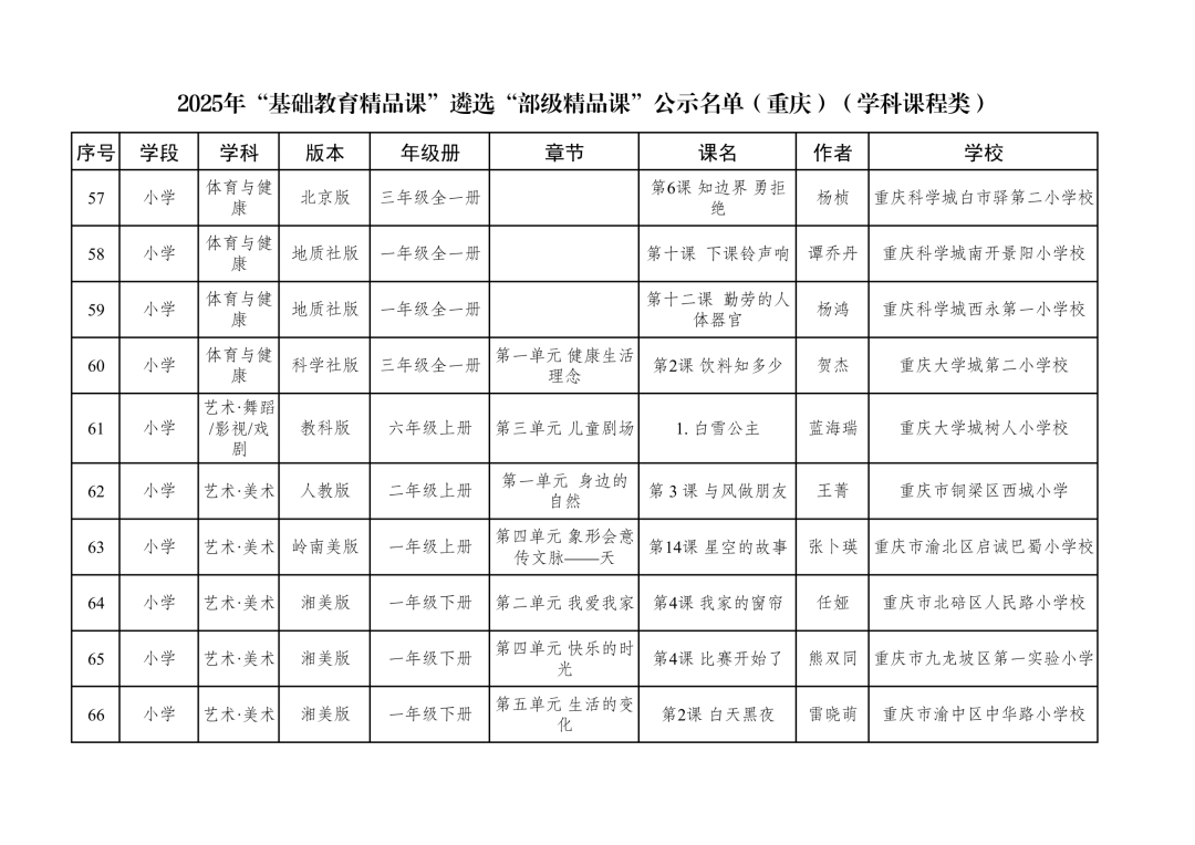 2025年“基础教育精品课”遴选“部级精品课”公示名单(重庆)(学科课程类)