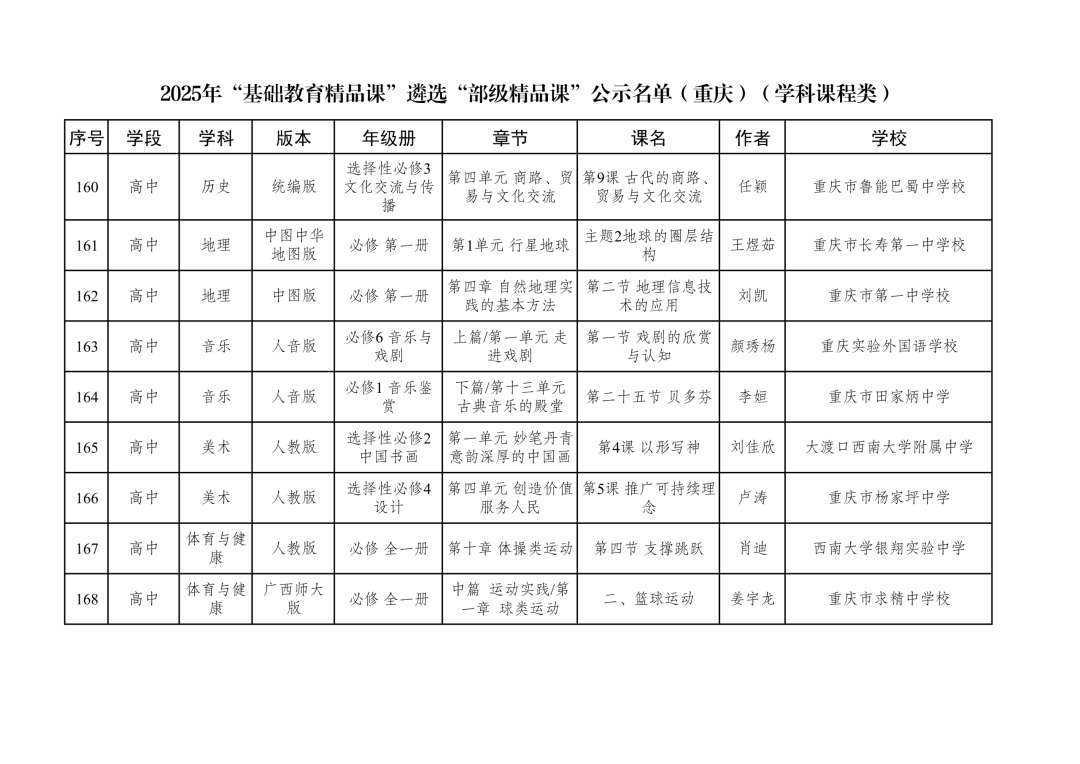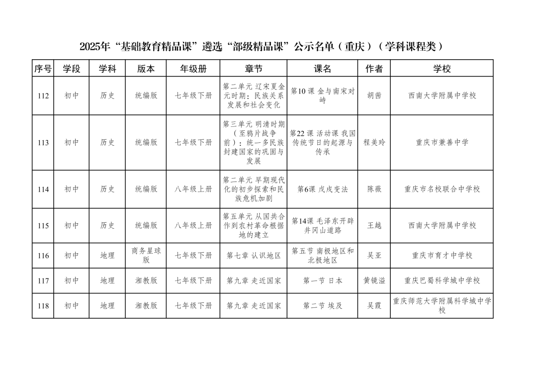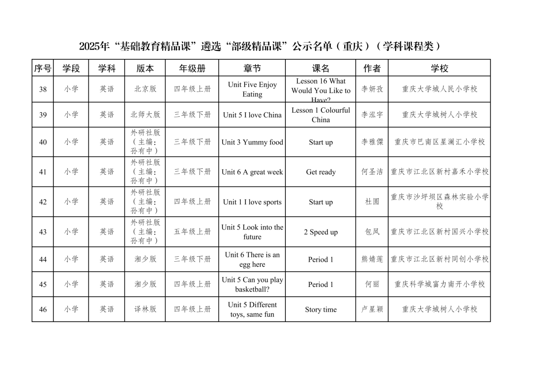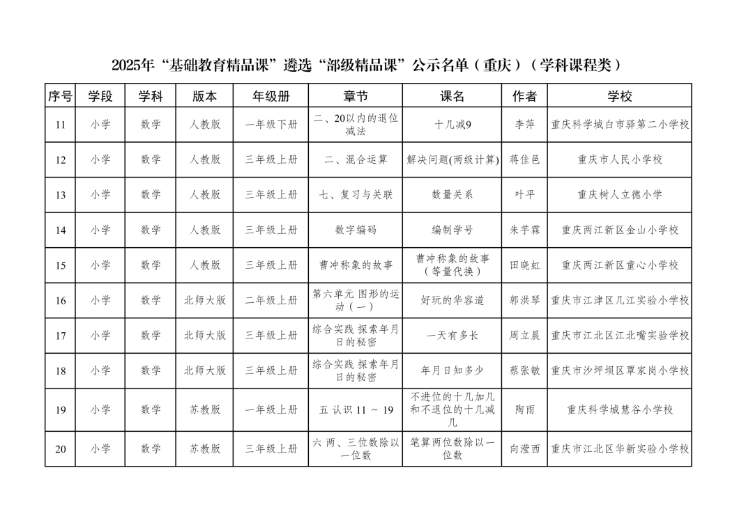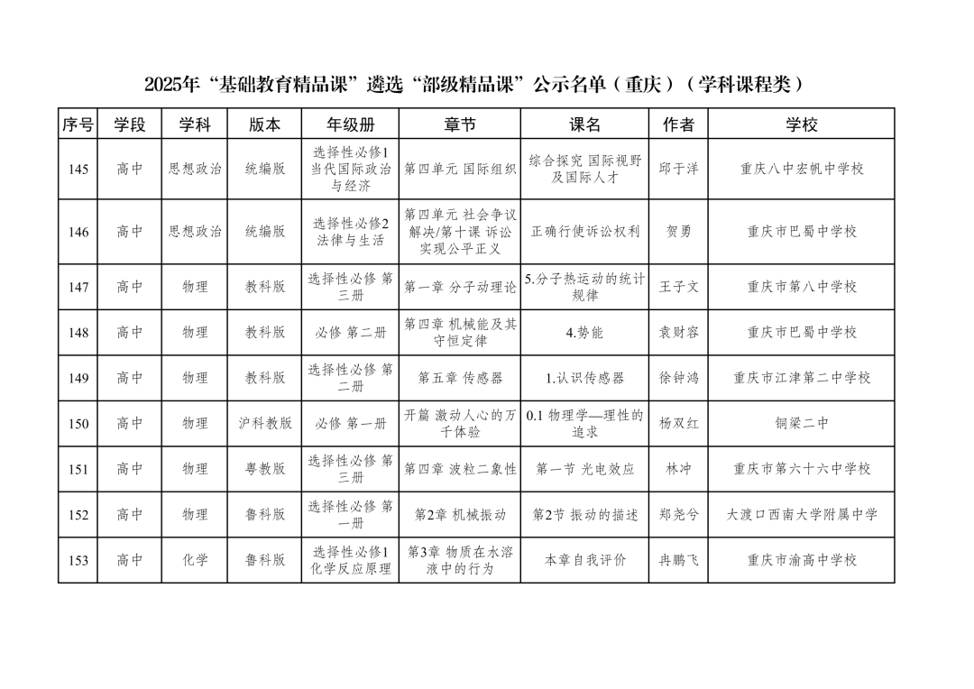 2025年“基础教育精品课”遴选“部级精品课”公示名单(重庆)(学科课程类)