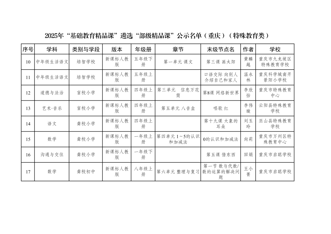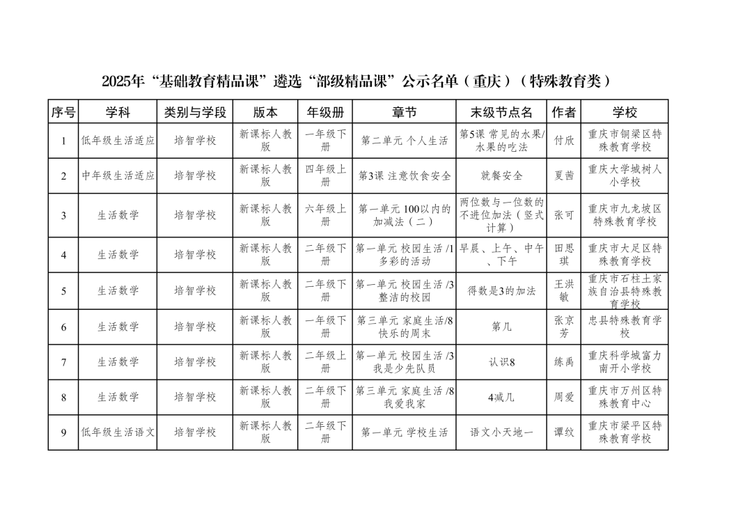 2025年“基础教育精品课”遴选“部级精品课”公示名单(重庆)(特殊教育类)