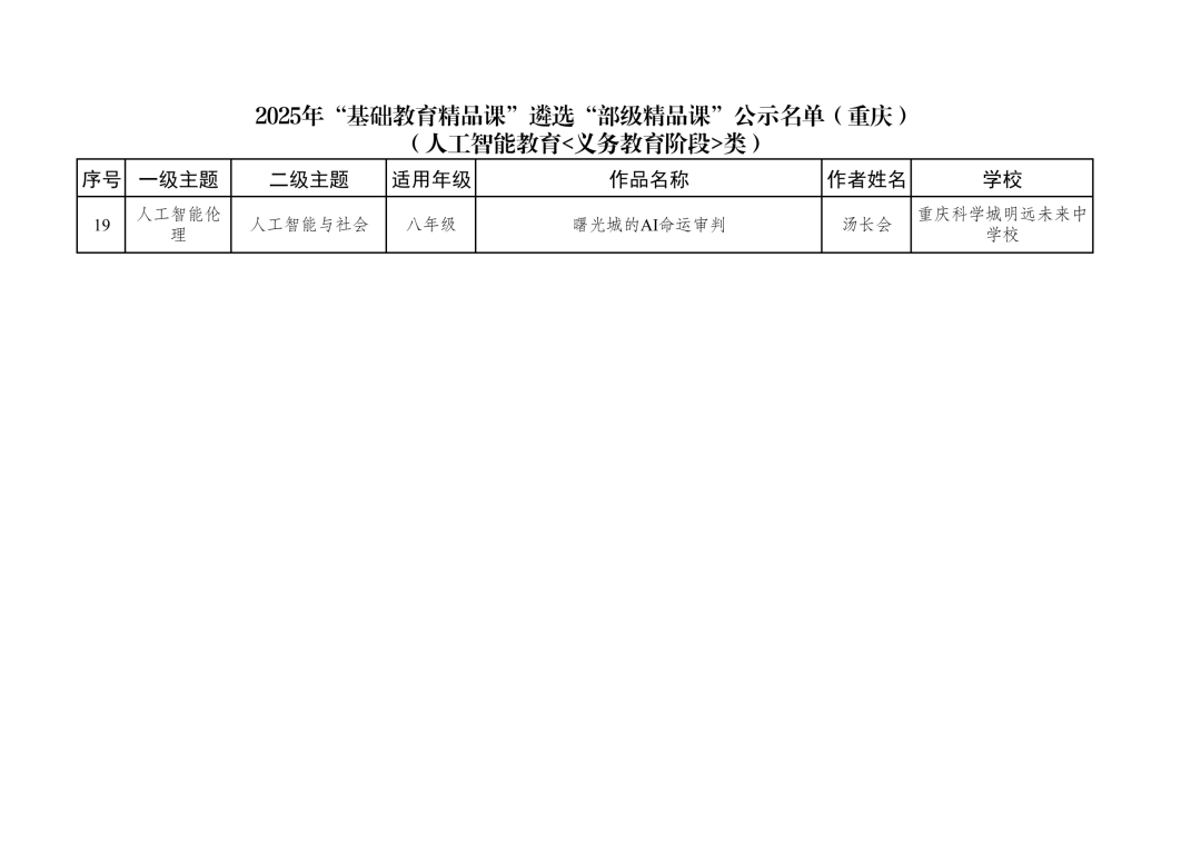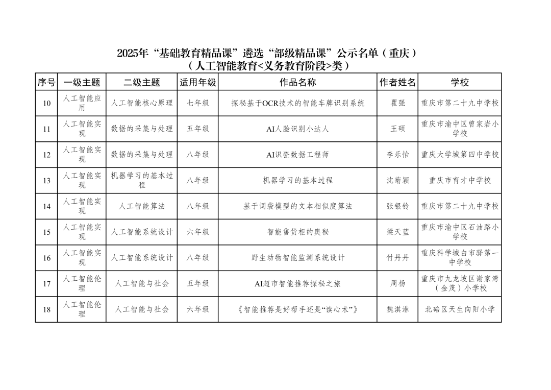 2025年“基础教育精品课”遴选“部级精品课”公示名单(重庆)(人工智能教育<义务教育阶段>类)