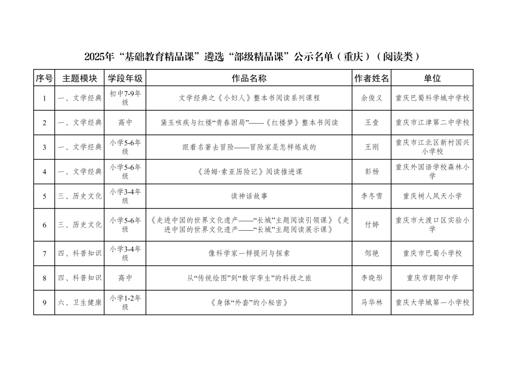 2025年“基础教育精品课”遴选“部级精品课”公示名单(重庆)(阅读类)
