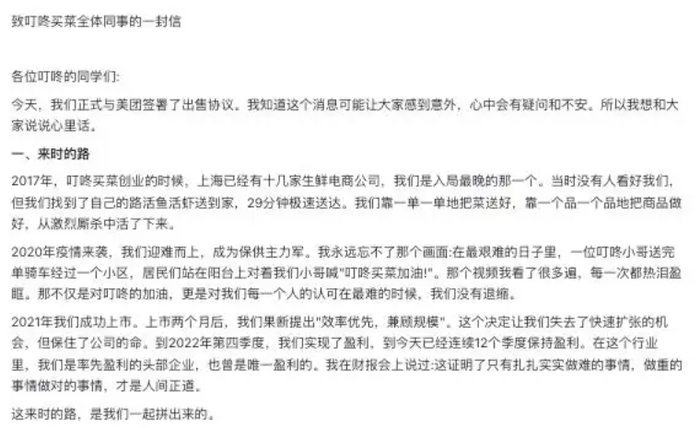 叮咚买菜为何盈利期“卖身”美团?创始人内部信曝光:放下较量,并肩同航