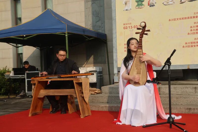 领导及来宾朋友参观展览 展览由永川区文化和旅游发展委员会主办,永川博物馆、永川美术馆、永川区图书馆承办,永川堃航博物馆、永川区蕴宝博物馆协办。永川区著名书画家、书法家现场书写并赠送书法、绘画新年祝福作品,永川音乐家进行古琴、琵琶表演。永川美术家协会、永川区兰花协会、永川区收藏家协会等30余名代表参加开幕式。