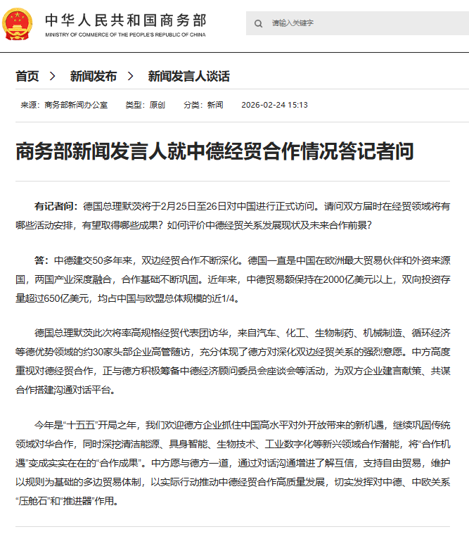 今年是“十五五”开局之年,我们欢迎德方企业抓住中国高水平对外开放带来的新机遇,继续巩固传统领域对华合作,同时深挖清洁能源、具身智能、生物技术、工业数字化等新兴领域合作潜能,将“合作机遇”变成实实在在的“合作成果”。中方愿与德方一道,通过对话沟通增进了解互信,支持自由贸易,维护以规则为基础的多边贸易体制,以实际行动推动中德经贸合作高质量发展,切实发挥对中德、中欧关系“压舱石”和“推进器”作用。