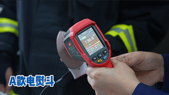 实验中,消防员对两款小熨斗分别通电并测量底部加热区域的温度变化情况。