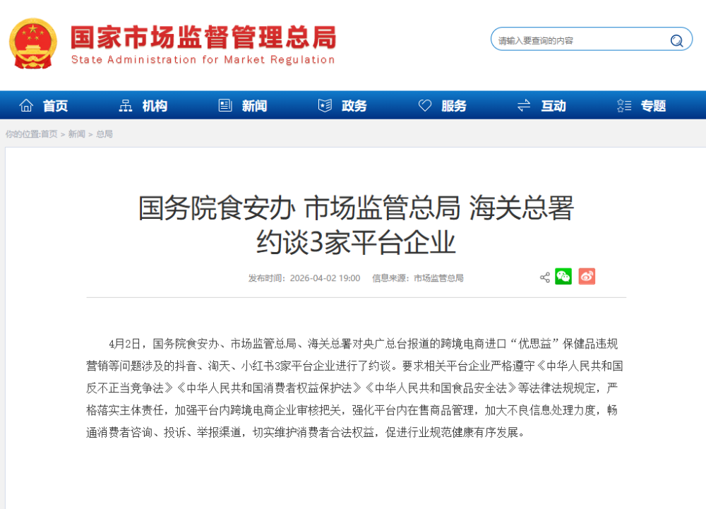 4月2日,国务院食安办、市场监管总局、海关总署对央广总台报道的跨境电商进口“优思益”保健品违规营销等问题涉及的抖音、淘天、小红书3家平台企业进行了约谈。要求相关平台企业严格遵守《中华人民共和国反不正当竞争法》《中华人民共和国消费者权益保护法》《中华人民共和国食品安全法》等法律法规规定,严格落实主体责任,加强平台内跨境电商企业审核把关,强化平台内在售商品管理,加大不良信息处理力度,畅通消费者咨询、投诉、举报渠道,切实维护消费者合法权益,促进行业规范健康有序发展。