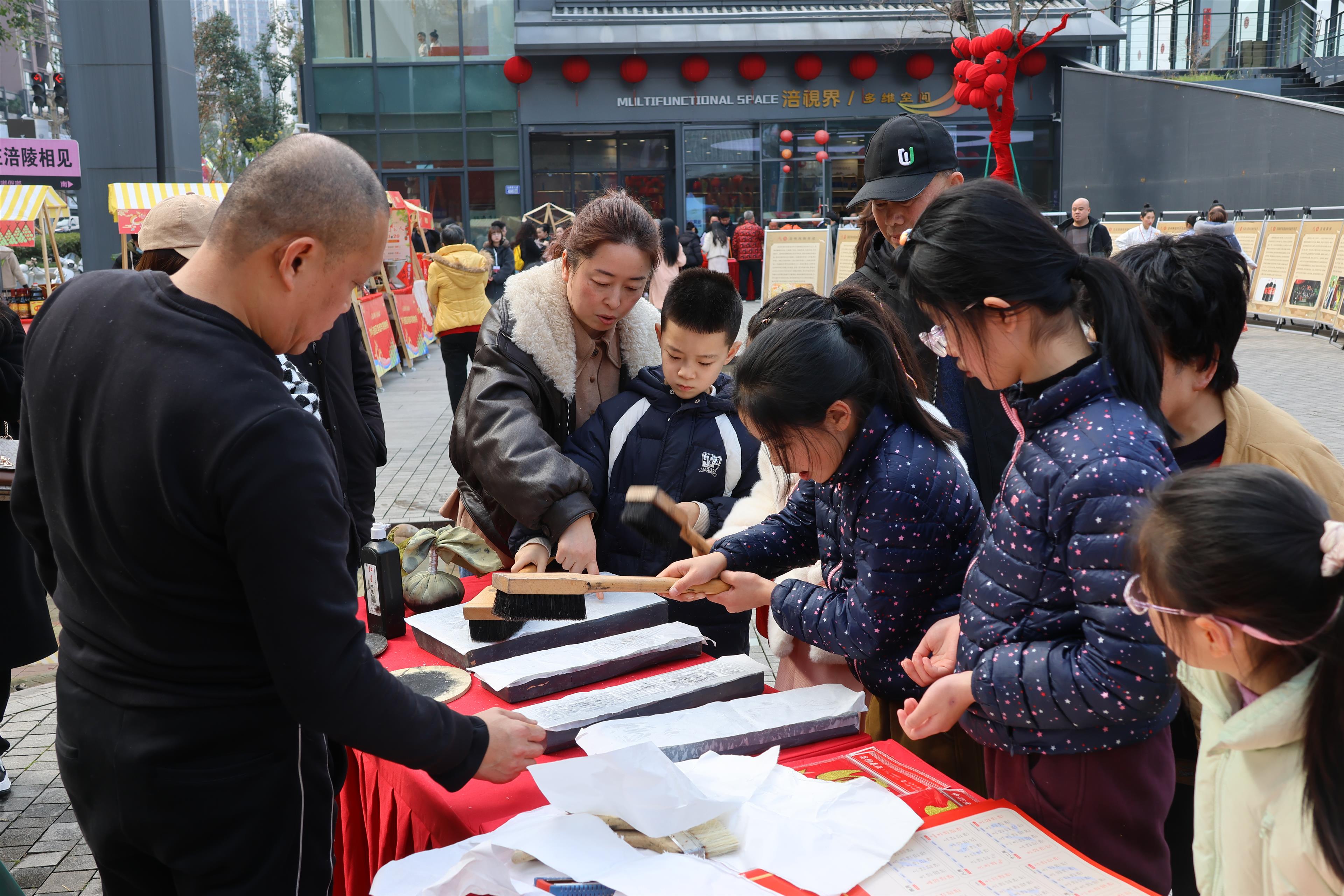在涪州传拓制作技艺体验区,市民踊跃动手拓印“白鹤时鸣”“白鹤梁”“钩深堂”等镌刻着涪陵记忆的题刻文字,在墨香与宣纸间感受非遗之趣、乡愁之深。