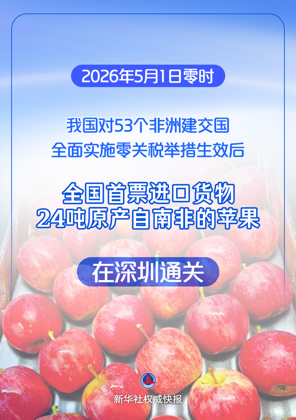 1日零时,深圳湾口岸迎来举措生效后全国首票进口货物。24吨原产自南非的苹果,经深圳海关快速监管验放后,将分销至全国各大商超及果蔬批发市场。本次进口南非苹果关税由10%降至0,商品成本优势显著提升。